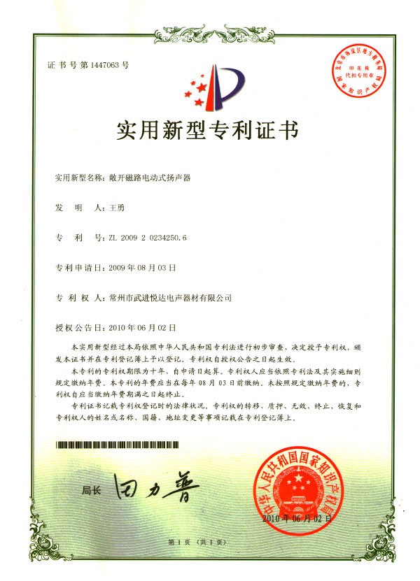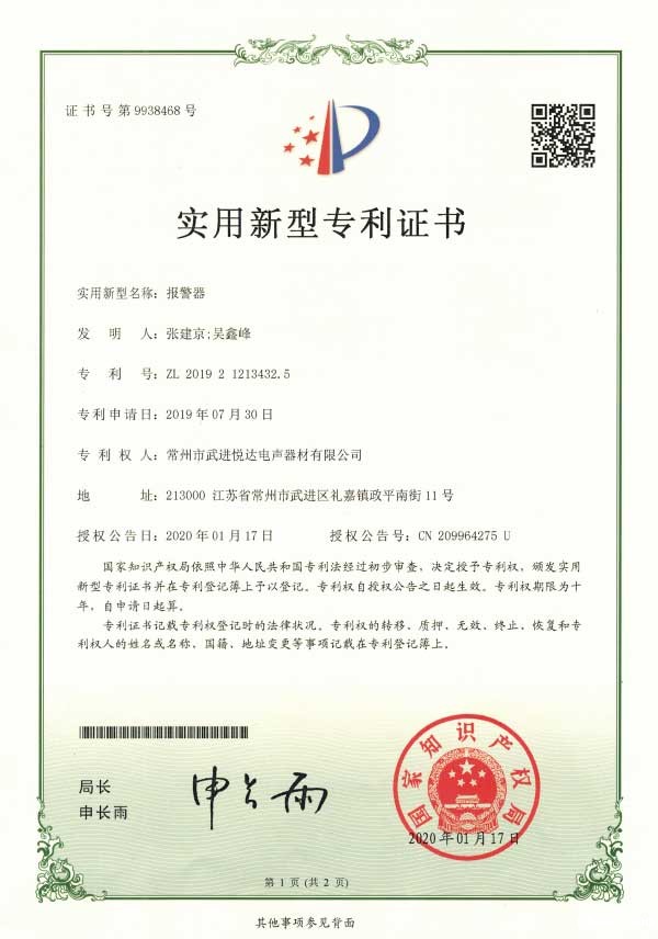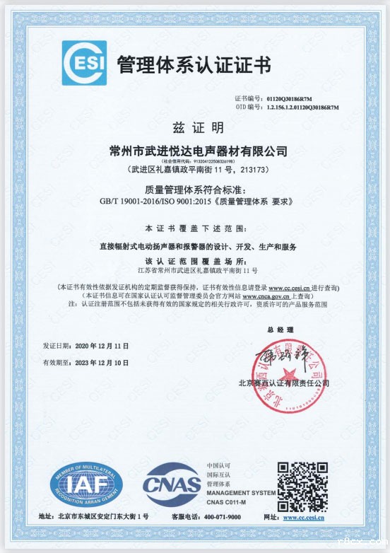 常州市武进悦达电声器材有限公司成立于1994年,是一家集报警器及扬声器研发、制造、销售于一体的高新技术企业。公司通过ISO9001质量体系认证、高新技术企业、江苏省民营科技企业、江苏省质量信用A级企业,并拥有多项发明专利及实用新型专利。产品满足不同客户多种场景中的声学应用,可广泛应用于工程机械、道路车辆、自动化设备、医疗仪器、机器人等智能设备,为您的产品定制专属的语(声)音解决方案。