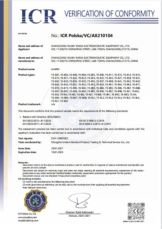 Yuesonic系列倒车报警器主要应用于各类工程机械,农业机械,商用车辆等,用于加强现场安全管理。产品获得CE认证,并经权威第三方实验室以及多家国内外知名企业长期使用验证,质量稳定可靠,远超其他同类产品。悦森扬声器追求卓越音质,主要应用于智能家居,以及其他各类智能设备,产品行销全球,广受客户好评。
