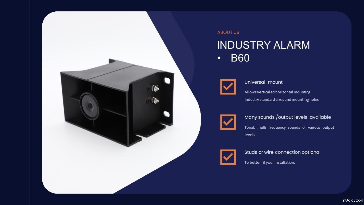 B60报警器系列产品适用于各种大中型车辆/设备,推荐中度及重度噪声区域使用。是工程机械领域使用较多的产品系列。