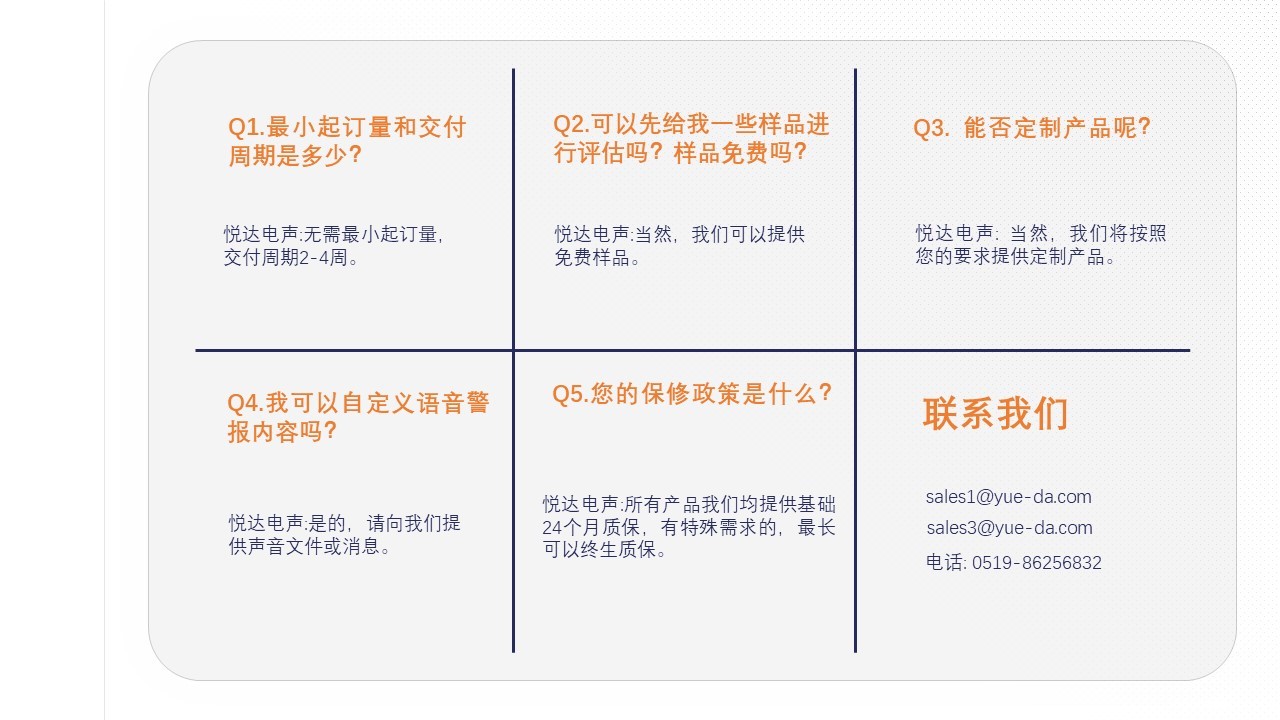 可变声压型号可根据外界噪声的变化调整输出音量,在保证提示效果的前提下减少噪声污染。坚固耐用,可应对各种严苛环境。元器件环氧树脂密封,耐冲击及抗震动效果好,防护等级高(IP68)。电压极性反向自动保护。安装方便,多种常用插头可选。符合RoHS标准,通过CE认证。