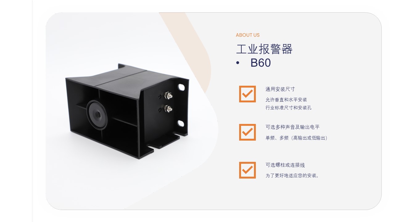 B60报警器系列产品适用于各种大中型车辆/设备,推荐中度及重度噪声区域使用。是工程机械领域使用较多的产品系列。